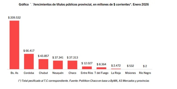 De acuerdo con el reporte privado durante enero los vencimientos de títulos públicos provinciales alcanzaron un total de $417.856 millones, con una variación del 0,5% interanual en términos reales y -60,1% respecto al mes previo .