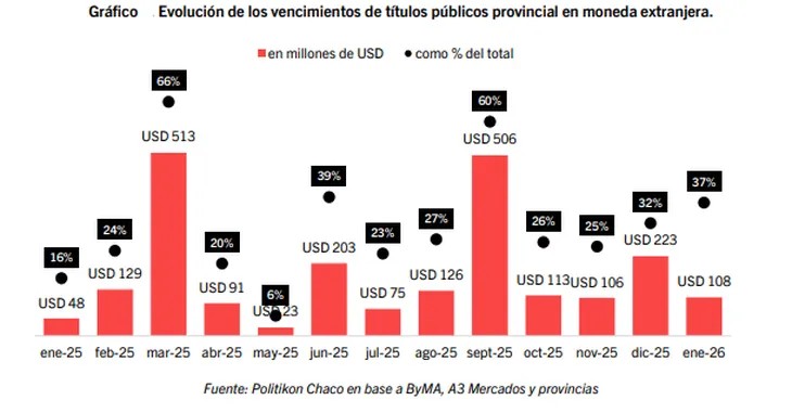En enero Córdoba pagó u$s35,3 millones del CO32d y u$s10 millones del CO26; Chubutoabonó u$s32 millones del PUL26; Neuquén abono u$s26,6 millones del BNA26 y Tierra del Fuego u$s5,8 millones del TFU27.