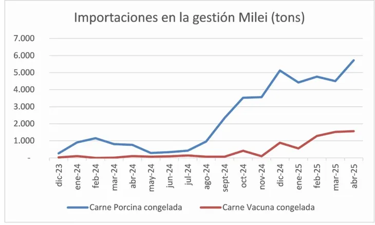 Según datos del Instituto para el Desarrollo Agroindustrial de Argentina, la importación de carne vacuna viene creciendo. En lo que va del 2025 el ingreso de mercadería alcanzó las 1.200 toneladas mensuales, en el caso del sector porcino es aún más relevante: 5.700 toneladas al mes. Además, por la pérdida de competitividad las exportaciones de carne de vaca cayeron un 30%.