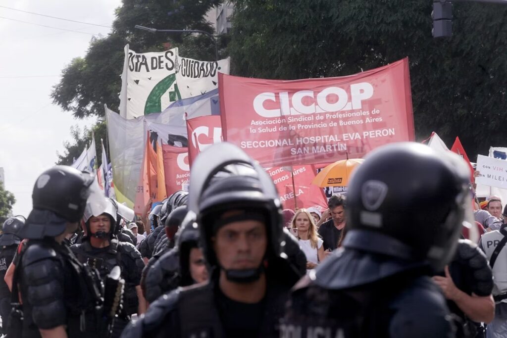 Más de un centenar de organizaciones se dirigen desde el Ministerio de Salud de la Nación hacia la Plaza de Mayo en defensa de la Salud Pública. Fuerte presencia policial. Postales de la movilización.