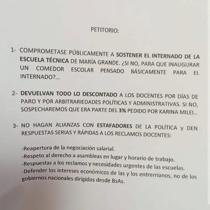Docentes de María Grande entregaron un reclamo al gobernador Frigerio. Fue este martes, antes que el primer mandatario ingresara a la Escuela Técnica de dicha localidad en la que se inauguró el nuevo comedor.