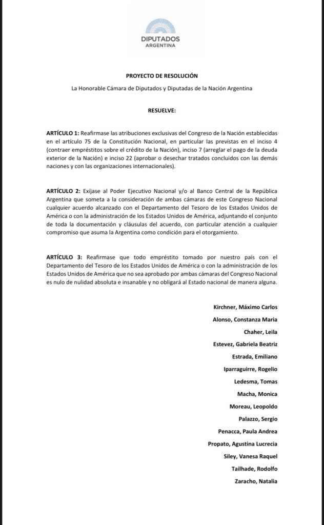 En ese contexto, el peronismo comenzó lo que puede ser un camino de oposición a un préstamo directo del Tesoro estadounidense, del cual aún no se conoce el monto ni las condiciones que implicaría para el país. El artífice de esa reacción fue el diputado nacional y líder de La Cámpora, Máximo Kirchner, quien junto a una decena de diputados presentó un proyecto de Resolución para desconocer toda deuda que el Ejecutivo tome sin pasar por el Congreso de la Nación.