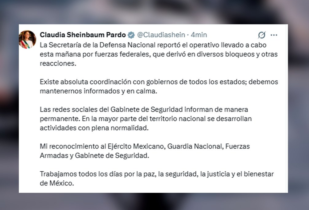 La presidenta de México se refirió a la muerte del líder del Cártel Jalisco Nueva Generación, «El Mencho» tras un operativo llevado a cabo por Ejército, y a los disturbios que esto ocasionó en distintas localidades.