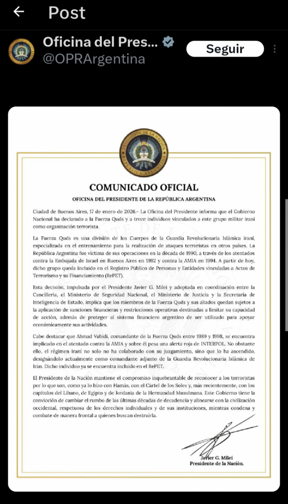 En el texto oficial se explicó que la Fuerza Quds constituye “una división de los Cuerpos de la Guardia Revolucionaria Islámica iraní, especializada en el entrenamiento para la realización de ataques terroristas en otros países”. En ese marco, el Gobierno recordó que “la República Argentina fue víctima de sus operaciones en la década de 1990, a través de los atentados contra la Embajada de Israel en Buenos Aires en 1992 y contra la AMIA en 1994”.