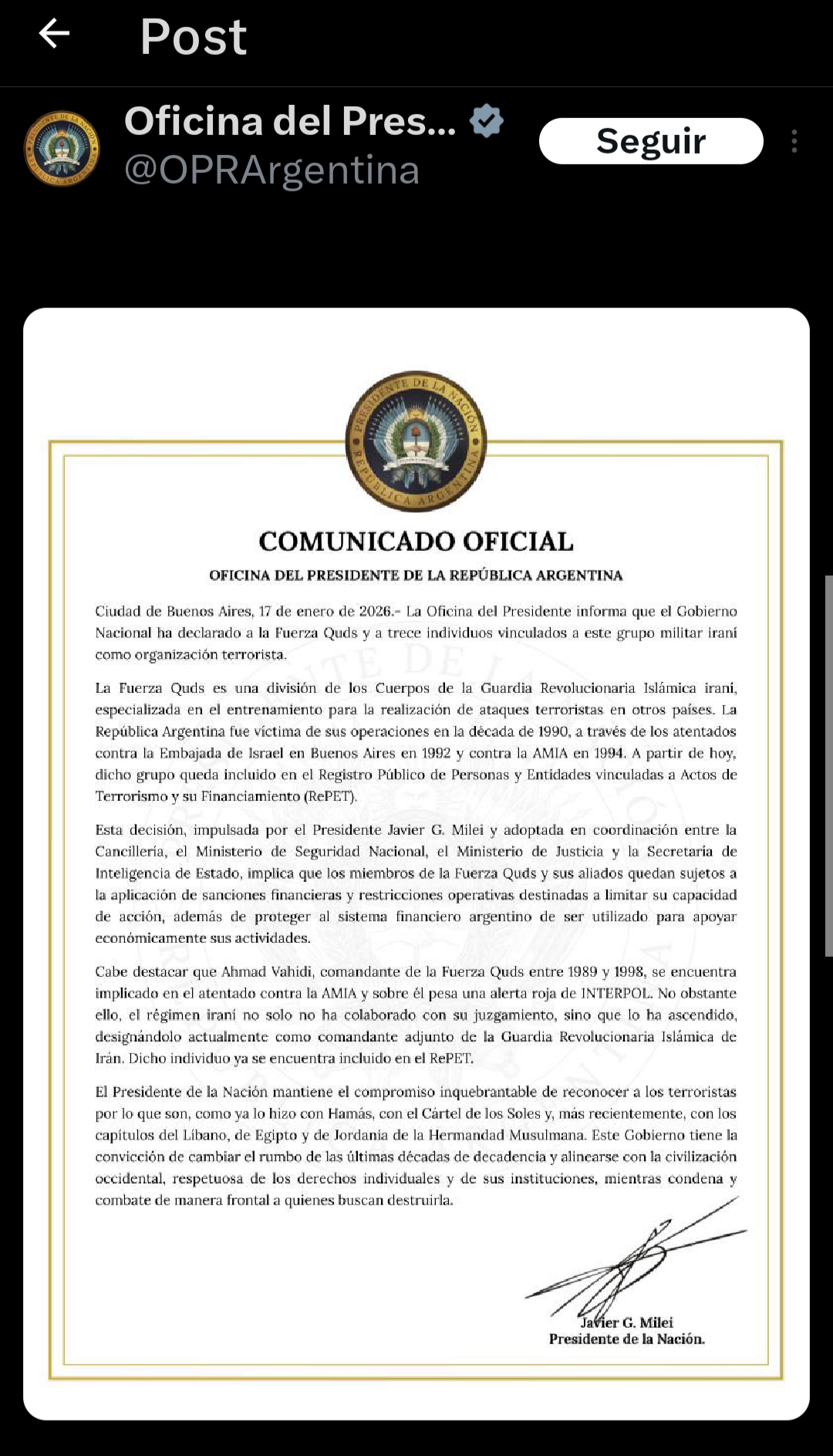 En el texto que lleva la firma de Milei, denuncian que uno de los líderes de la fuerza, Ahmad Vahidi, formó parte de los atentados contra la AMIA y contra la Embajada de Israel a principios de la década de 1990.