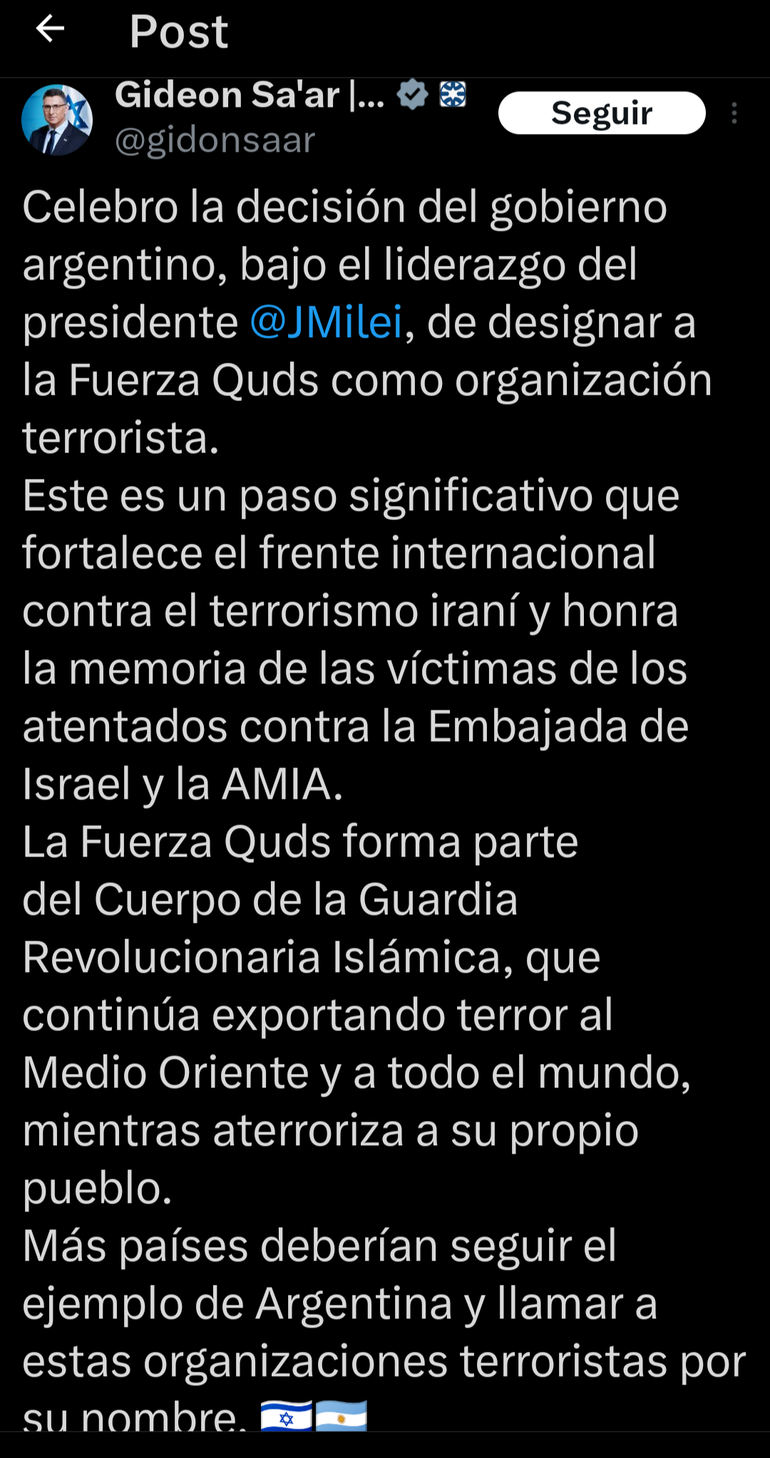 El ministro de Relaciones Exteriores de Israel, Guideon Saar, manifestó su apoyo a la decisión del Gobierno de declarar como organización terrorista a la Fuerza Quds, con orígenes vinculados al territorio de Irán. El israelí afirmó que se trata de un «paso significativo» e instó al resto del mundo a «seguir el ejemplo de la Argentina».