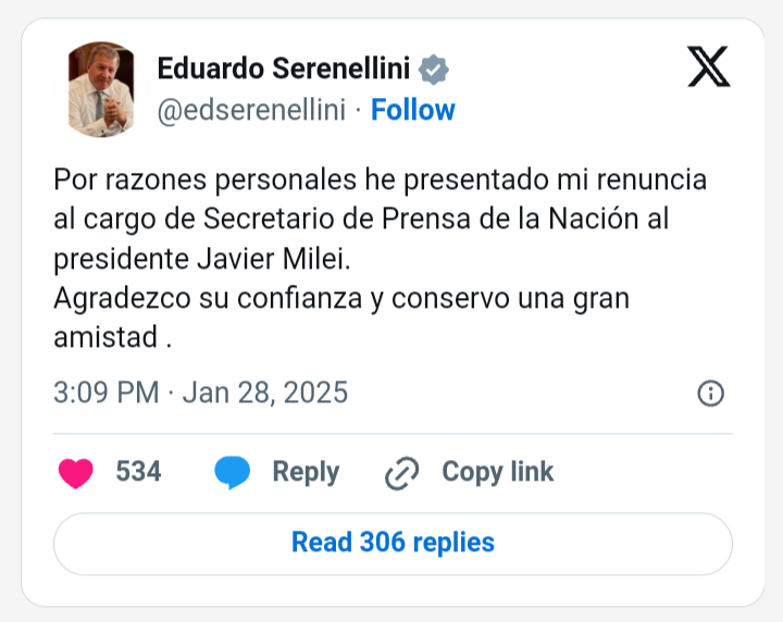 El secretario de Prensa de la Presidencia, Eduardo Serenellini, renunció este lunes a su cargo y lo informó a través de la red social X, informó: “Por razones personales he presentado mi renuncia al cargo de Secretario de Prensa de la Nación al Javier Milei. Agradezco su confianza y conservo una gran amistad”.