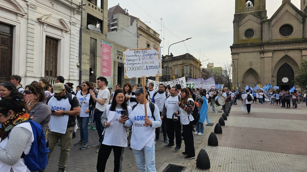 Una importante columna de docentes de Agmer, AMET y Sadop se movilizó por las calles céntricas de Paraná hacia Casa de Gobierno, para reclamar mejoras salariales acordes a la inflación.