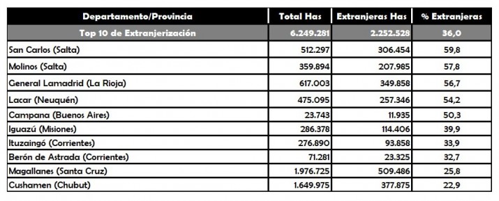 Los Departamentos más extranjerizados son el de Bariloche con 23.050 hectáreas (13,6%) en manos de terratenientes de otros países; mientras que por detrás se ubican el de Pilcaneyeu con 95.250 hectáreas (10,5%); el de Ñorquinco con 34.843 hectáreas (5,5%) y el de Avellaneda con 69.506 hectáreas (3,9%).