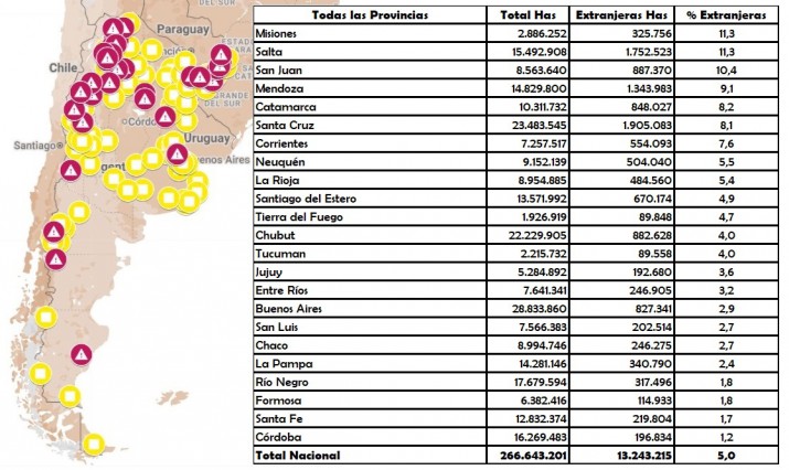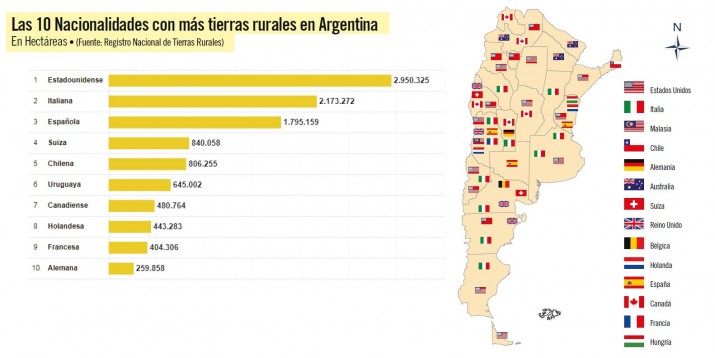En todo el país los mayores propietarios extranjeros de tierras argentinas provienen de Estados Unidos con un total de 2.950.325 hectáreas, seguidos por los de Italia con 2.173.272 hectáreas y los de España con 1.795.159 hectáreas. También se inscriben en la lista de extranjerización nacional propietarios de Suiza, Chile, Uruguay, Canadá, Holanda, Francia y Alemania.