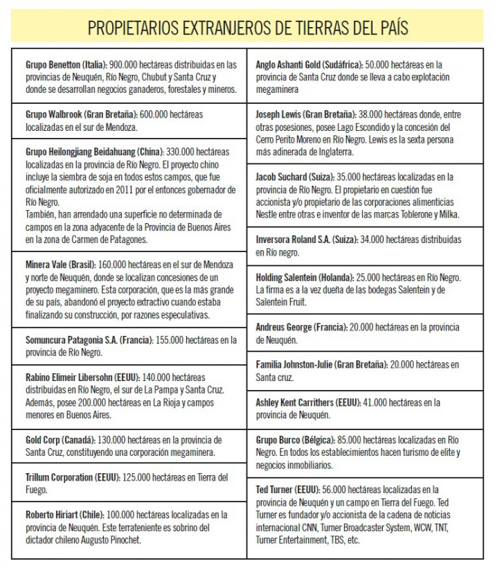 Al tope de los extranjeros que conquistaron territorio argentino se ubica el Grupo Benetton de la familia italiana que compró un total de 924.000 hectáreas. Los Benetton poseen una mayor proporción de las tierras adquiridas en Argentina en la provincia de Chubut, pero también extendieron sus tentáculos hasta las estancias compradas en Santa Cruz, Neuquén y Río Negro.
