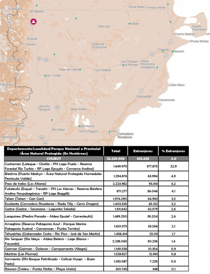 Mientras que en el tercer escalón se posicionó el Departamento chubutense de Cushamen que tiene una extensión de 1.649.975 hectáreas y los terratenientes extranjeros concentran 377.875 hectáreas, dejando un saldo del 22,9%.
