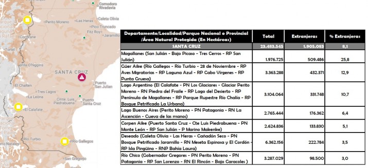 El informe elaborado por El Extremo Sur (con sus respectivos gráficos y tablas) muestra que Santa Cruz es la provincia más extranjerizada con el 8,1% de las tierras en manos de dueños foráneos; seguida por Neuquén con el 5,5%; Tierra del Fuego con el 4,7%; Chubut con el 4% y Río Negro con un 1,8%. Los colonizadores extranjeros tienen en su poder más de la mitad (54,2%) de las tierras en el departamento neuquino de Lacar (San Martín de los Andes); el 25,8% del departamento santacruceño de Magallanes (San Julián) y el 22,9% del territorio el chubutense en Cushamen (Leleque). La «legión extranjera» -conformada por estadounidenses, italianos, ingleses y qataríes- no solamente conquistó una porción estratégica del territorio patagónico, sino que además extendió su dominio hasta el poder político y se benefició con suculentos negocios en la región.