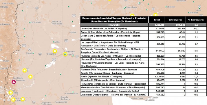 El Departamento de Lacar en Neuquén se ubica al tope con 475.095 hectáreas totales, de las cuales 257.346 están en manos de propietarios foráneos y con un nivel de concentración que trepa al 54,2%.