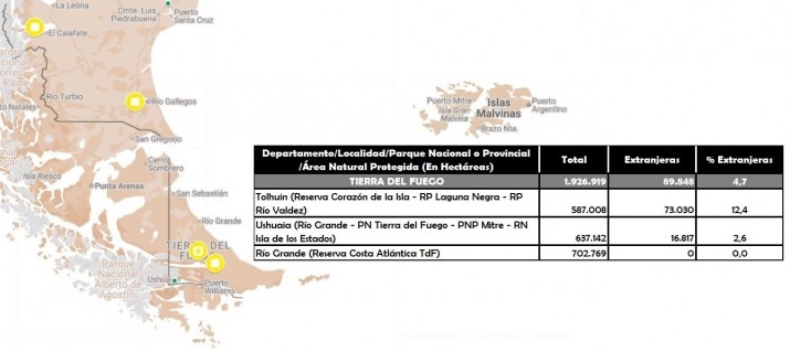 El Departamento Tolhuin tiene una ocupación extranjera de 73.030 hectáreas (12,4%) y en de Ushuaia de 16.817 hectáreas (2,6%).