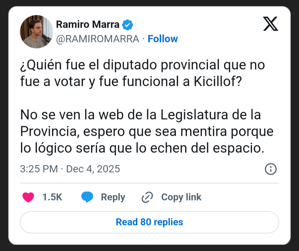 De hecho, la bronca apareció rápidamente en la bancada que conduce Agustín Romo y luego se esparció a otras “sucursales” de LLA en todo el país. En medio del revuelo, uno de los más críticos fue el exlegislador porteño Ramiro Marra: pese a que él mismo fue forzado a abandonar el partido el año pasado, el dirigente respaldó a LLA y cruzó a Vera por ser “funcional a Kicillof” con la artimaña de anoche. “Lo lógico sería que lo echen del espacio”, sentenció.