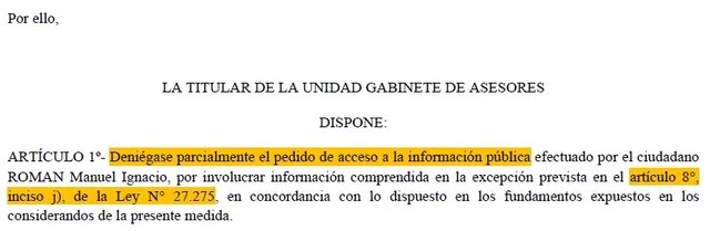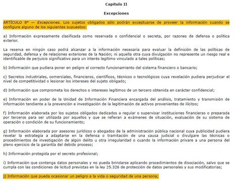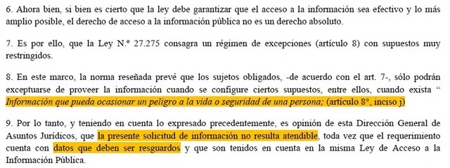 Sin embargo, el Ministerio de Defensa bloqueó toda manera de conocer de quiénes se trata. Las autoridades basaron su argumentación en “la excepción prevista en el artículo 8°, inciso j), de la Ley N°27.275”. Es una justificación un tanto inesperada, ya que ese punto le concede un pase libre a la “información que pueda ocasionar un peligro a la vida o seguridad de una persona”. No queda claro cómo actúa ese principio en la situación aquí comentada.