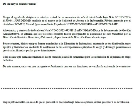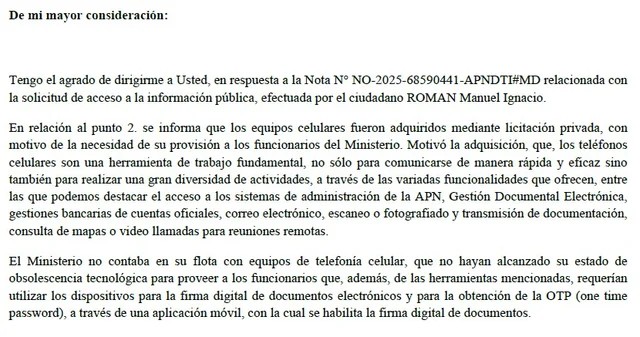 Luego precisó que “el Ministerio no contaba en su flota con equipos de telefonía celular que no hayan alcanzado su estado de obsolescencia tecnológica” y subrayó que “requerían utilizar los dispositivos para la firma digital de documentos electrónicos y para la obtención de OTP (one time password) a través de una aplicación móvil con la cual se habilita la firma digital de documentos”, lo que permite inferir que podrían ser funcionarios de rango relativamente alto.