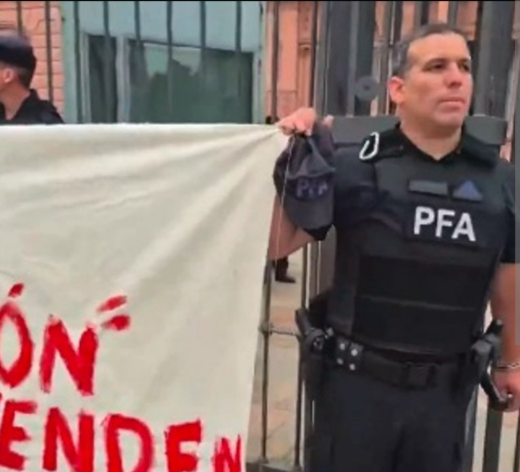 El cabo Miguel Ángel Montiel, que se encontraba uniformado y con el arma de servicio, de esposó a la reja de la Casa Rosada en reclamo por los demacrados sueldos que perciben en la fuerza, también denunció el abandono de la obra social y el Hospital Churruca.
