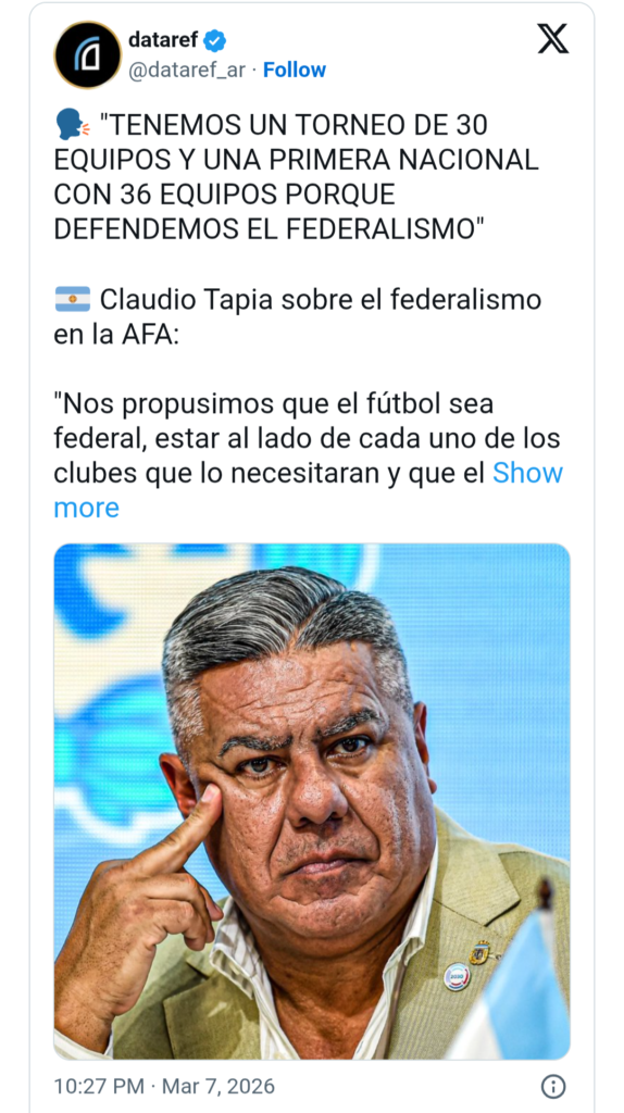 En esa línea, Tapia volvió a defender la presencia del interior en los torneos nacionales. «Nos propusimos que el fútbol sea federal, estar al lado de cada uno de los clubes que lo necesitaran, que el federalismo le diera la posibilidad a todos. Por eso tenemos un torneo de 30 equipos, una Primera Nacional con 36 equipos, porque defendemos el federalismo. Por eso tenemos la Copa País, para que todas las provincias del interior se vean representadas».