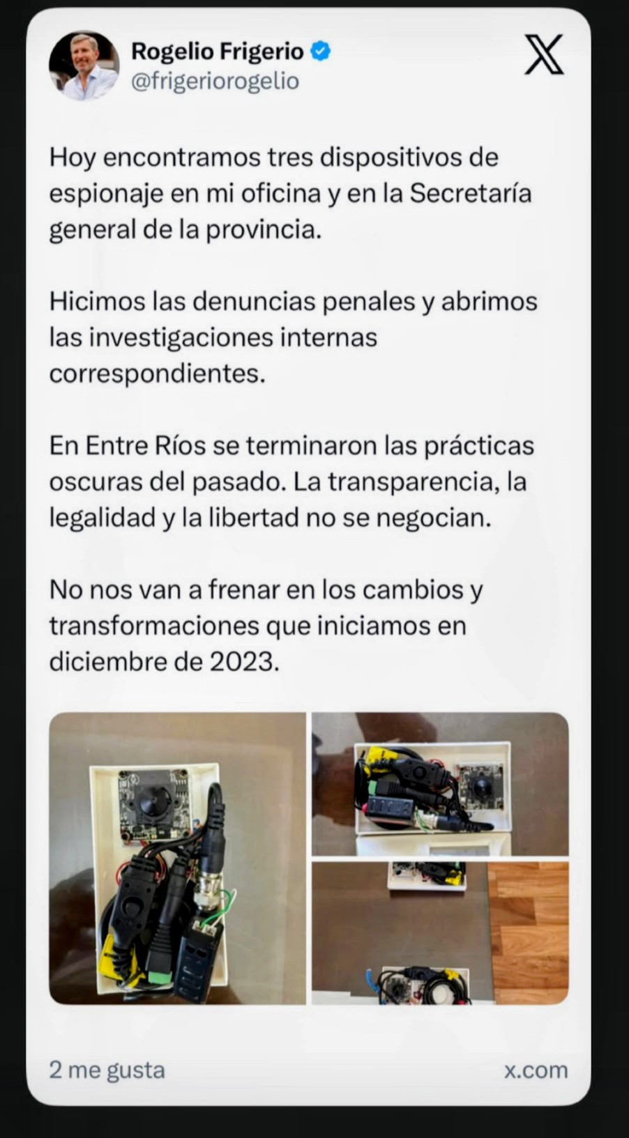El Gobierno de la provincia de Entre Ríos informó que hoy encontraron dispositivos de grabación de audio y video ocultos en dependencias oficiales. Algunos de estos aparatos estaban escondidos en las oficinas del gobernador Rogelio Frigerio y en la Secretaría General de la Gobernación, a cargo de Mauricio Colello.