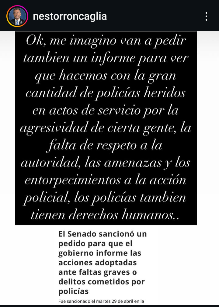 «Оk, me imagino que van a pedir también un informe para ver qué hacemos con la gran cantidad de policías heridos en actos de servicio por la agresividad de cierta gente, la falta de respeto a la autoridad, las amenazas y los entorpecimientos a la acción policial», destacó Roncaglia quien agregó: «los policías también tienen derechos humanos».