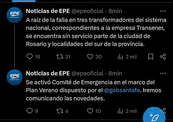 La avalancha de avisos, y quejas de usuarios, por el corte comenzaron a inundar las redes sociales desde minutos antes de las 14, aunque en algunas zonas la falta de electricidad se hizo sentir mucho antes. Usuarios de distintos puntos de la ciudad, como el centro, barrio Abasto, Martin y Echesortu, reportaron que están sin energía eléctrica.