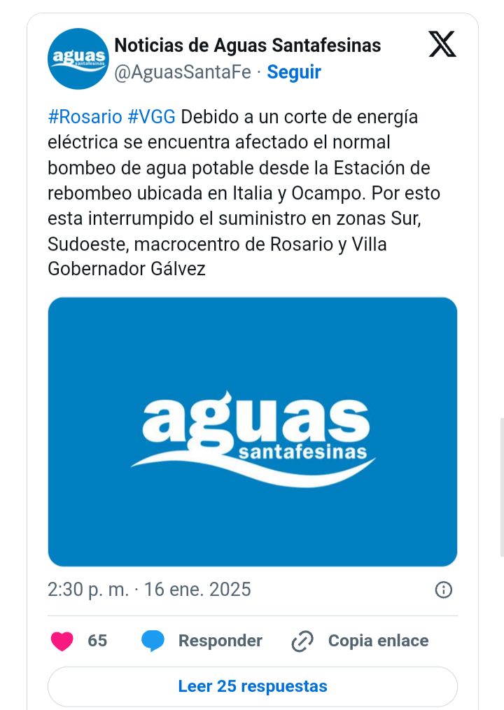 Aguas Santafesinas informó a sus usuarios que debido al corte en el suministro eléctrico, se encuentra afectado el normal bombeo de agua potable desde la estación de rebombeo “C” ubicada en Italia y Ocampo.