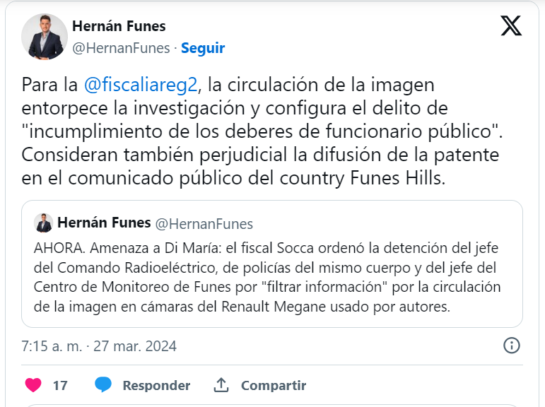 El Megane gris utilizado en el hecho fue encontrado en zona oeste. Por la difusión del material de las cámaras de seguridad, el fiscal Socca pidió detener a los jefes del Comando Radioeléctrico y del Centro de Monitoreo de Funes.