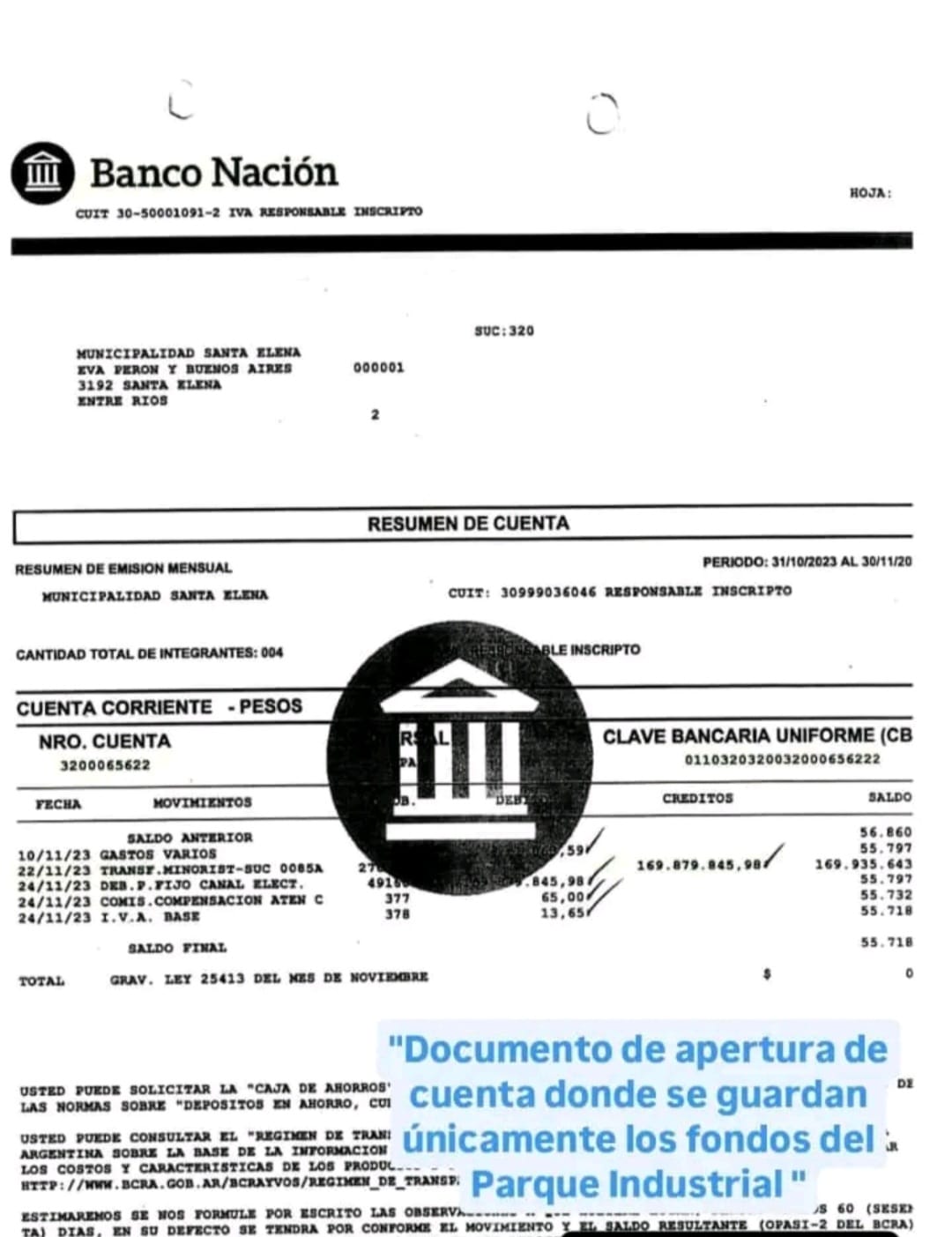 Y detalló: «El 25 de octubre de 2023, la Secretaría de Industria y Desarrollo Productivo de la Nación otorgó a la Municipalidad de Santa Elena un Aporte No Reintegrable por $169.879.845,98 para el Desarrollo de Parque Industrial. El 22 de noviembre de 2023, la Municipalidad de Santa Elena abrió una cuenta corriente individual N° 3200065622 en el Banco Nación exclusivamente para el ingreso de estos fondos. Y esta plata, desde que ingresó, se usó para pagar las obras del parque industrial y generar intereses en plazo fijo. Nunca se utilizaron con otro destino.»