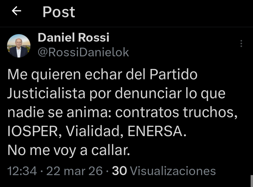 «Me quieren echar del Partido Justicialista por denunciar lo que nadie se anima: contratos truchos, IOSPER, Vialidad, ENERSA. No me voy a callar”, disparó Rossi, en declaraciones que rápidamente repercutieron en el ámbito político provincial.