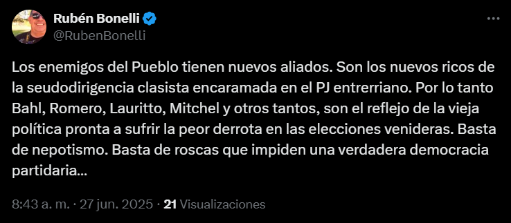 Las declaraciones del dirigente concordiense Rubén Bonelli no hacen más que poner en palabras lo que cientos de militantes, cuadros territoriales y afiliados vienen denunciando hace tiempo: el Partido Justicialista entrerriano está secuestrado por una casta de pseudodirigentes enriquecidos, que se sirven del partido como trampolín personal, mientras cierran el paso a toda expresión genuina del pueblo peronista.
