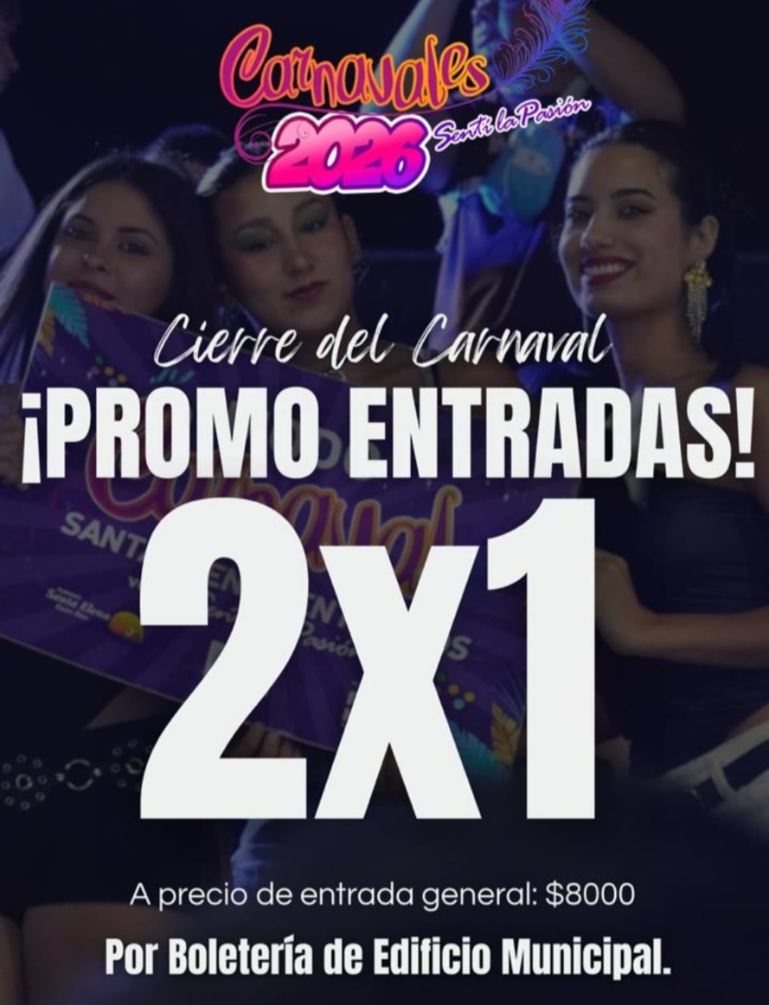 Por hoy (viernes 20) a partir de las 19:00 hs., accede a una promoción especial en entradas 2×1 para el gran cierre del carnaval en boleteria municipal