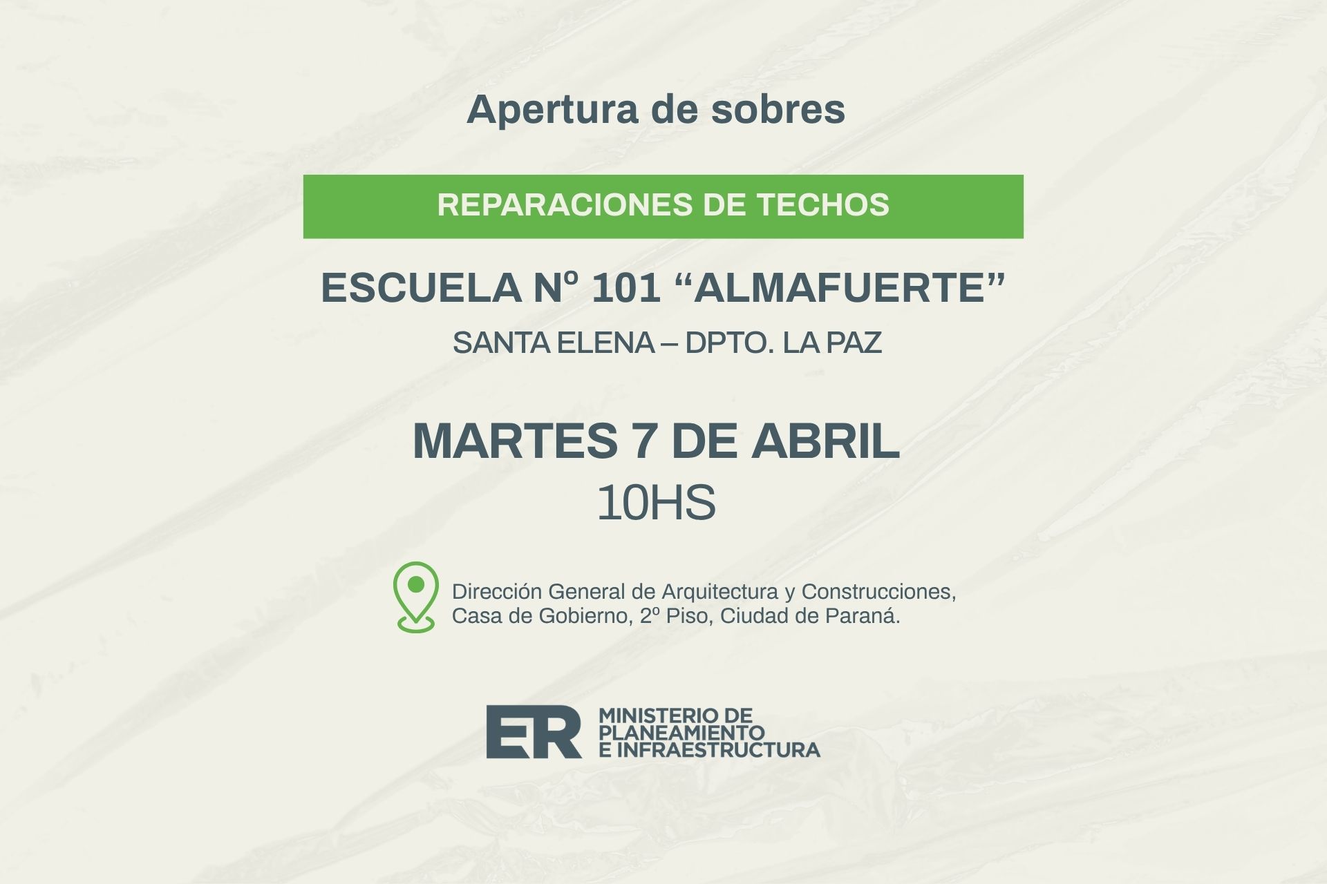 El Ministerio de Planeamiento e Infraestructura llevará adelante la apertura de sobres para la ejecución de obras de reparación de techos en la Escuela Primaria N° 101 Almafuerte de Santa Elena, en el departamento de La Paz.