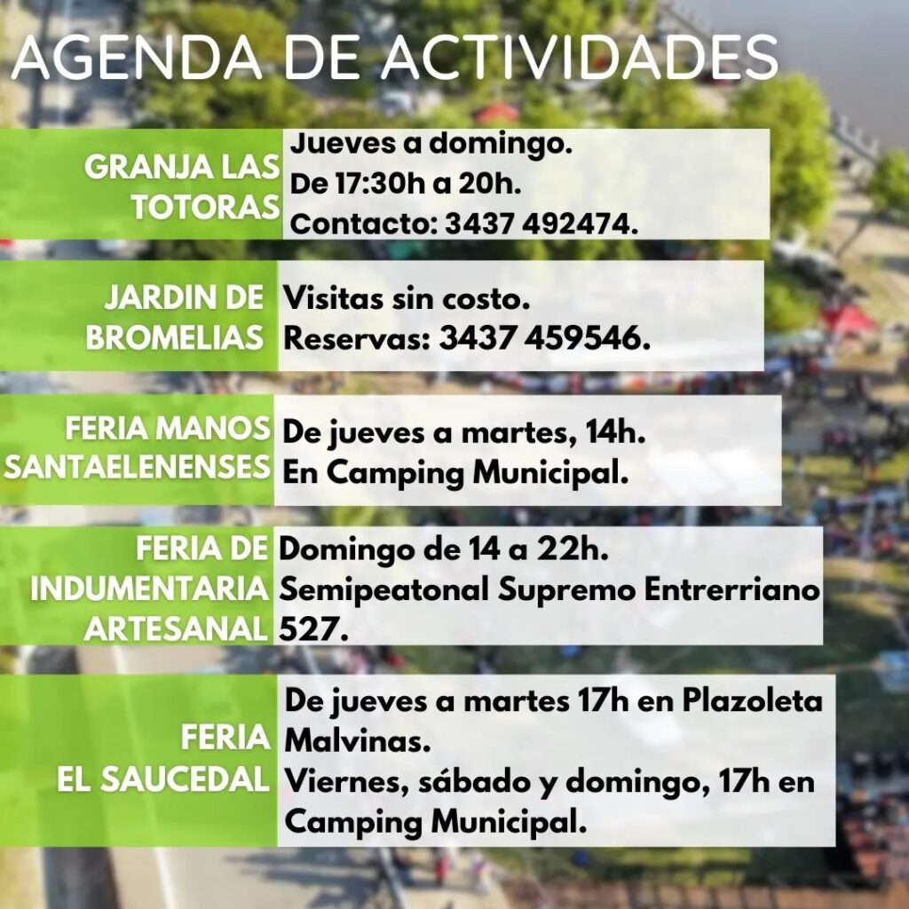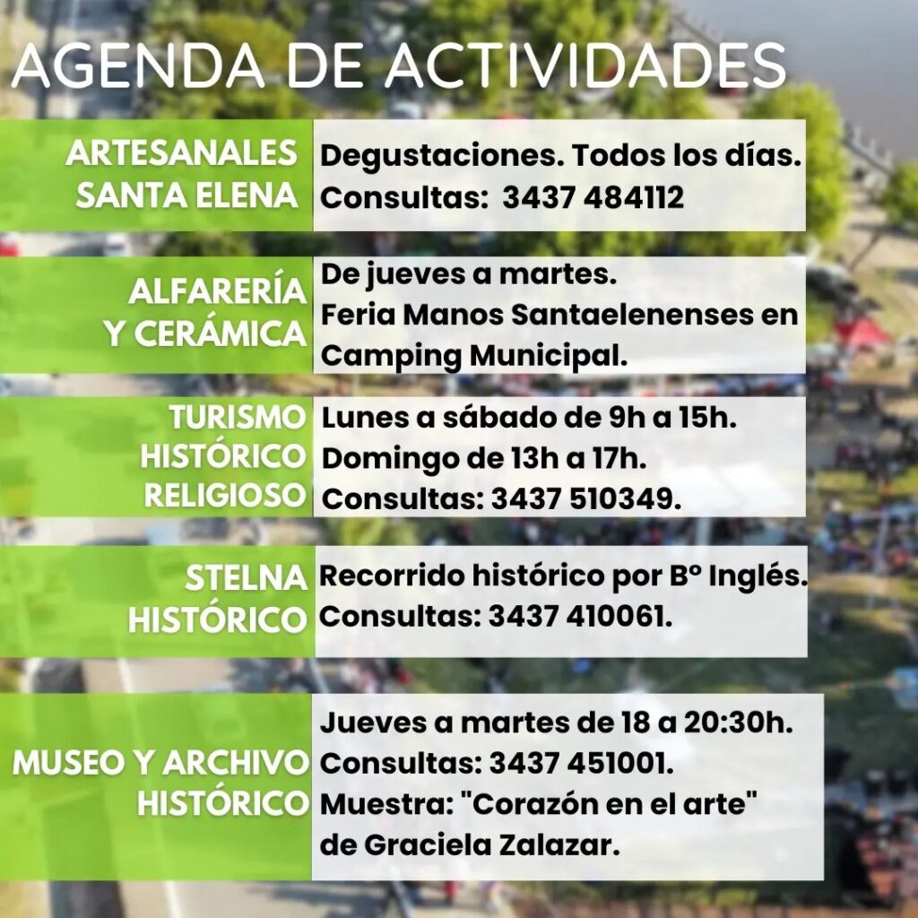 Desde Turismo del Municipio dieron a conocer el programa destinado a vivir un nuevo fin de semana largo con la mejor actividad diurna y nocturna. Actividades religiosas,gastronomía, cultura, productos regionales y un contacto pleno con la naturaleza. Con amigos o en familia, Santa Elena te espera.