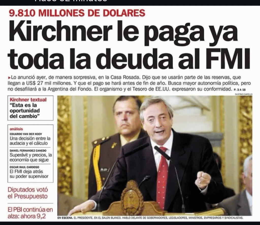 “Somos conscientes de estar transitando un momento histórico fundamental y estamos decididos a ser protagonistas de este cambio de época. Nos han educado durante mucho tiempo para la impotencia, para el ‘no se puede’, nos quieren hacer creer que lo nuestro nada vale, que no tenemos la capacidad o la constancia para valernos como nosotros, como país. Nos quisieron meter en el alma la certeza de que la realidad es intocable, nos quieren convencer de que son tan grandes las dificultades que es mejor que nada cambie. Quieren hacernos creer que no hacer nada nuevo es la única opción realista”, dijo Néstor Kirchner al anunciar el pago adelantado al FMI, el 15 de diciembre del 2005.