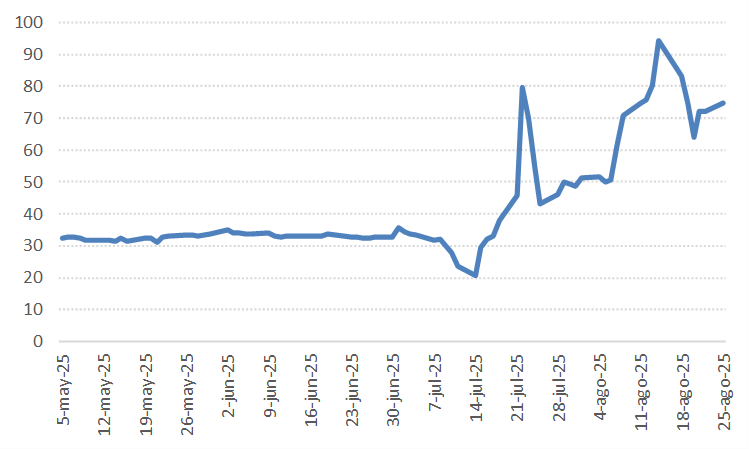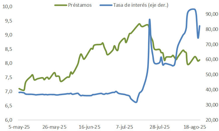 Sin embargo, cuando uno mira lo que está pasando con las tasas de interés en las últimas semanas, difícilmente pueda decirse que esto estaba planeado. Como se puede apreciar, la tasa de interés interbancaria (a la que se prestan los bancos entre sí), que venía mostrando un comportamiento muy estable en torno al 30%, se incrementó de manera desorbitada –y con mucha volatilidad– más que duplicándose en un par de semanas.
