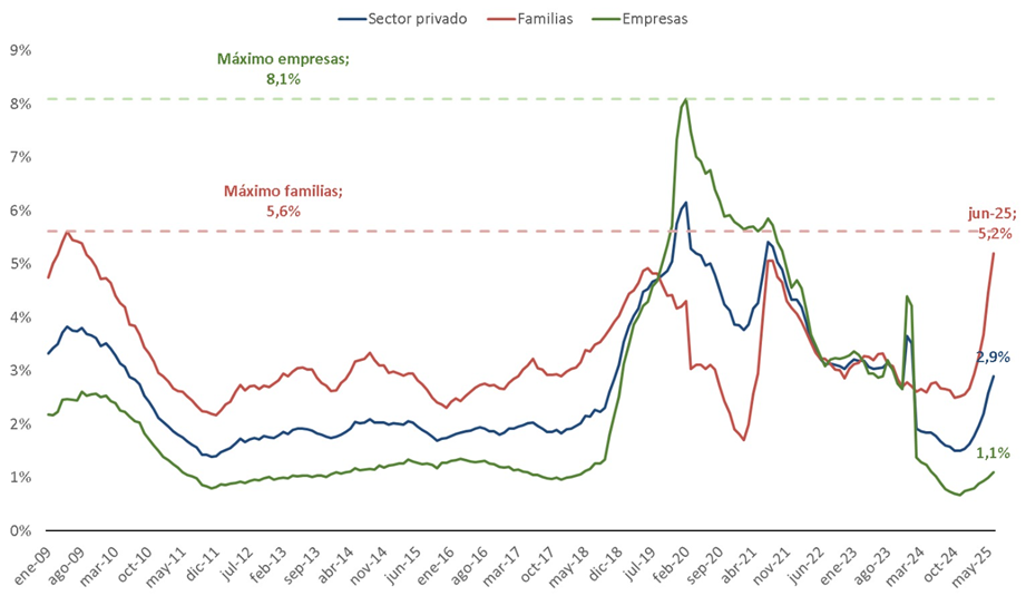 Vinculado con lo anterior, otro impacto relevante del aumento de las tasas se observa en la “irregularidad de la cartera” de los bancos, es decir, el porcentaje de los préstamos ya otorgados que presenta problemas de cobranza, especialmente en el caso de las familias. Como pueden ver, es sumamente preocupante el aumento que se observa en la irregularidad de los préstamos a las personas, que en dos meses pegó un saltó que lo dejó cerca de los máximos históricos (y que probablemente ya lo haya superado, dado que el último dato disponible es de junio).