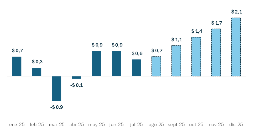 Como referencia, entre julio –momento donde comenzó la suba de tasas– y septiembre, esto implicaría un costo del 0,26% del PIB, monto muy similar al costo fiscal de la Ley de Emergencia en Discapacidad. Pero, más preocupante aún, si este aumento de tasas no fuera transitorio y se mantuviera por un año, ascendería a 3% del PBI, algo claramente insostenible para un gobierno que pretende mantener el equilibrio fiscal.