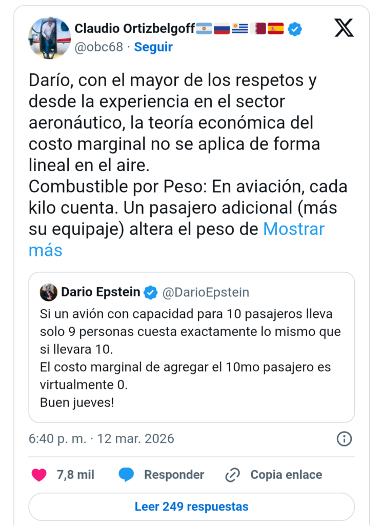 La red X se llenó automáticamente de funcionarios del Gobierno en apoyo al colega en desgracia –incluso de Santiago Caputo, acusado de las filtraciones originales por su pelea con Karina Milei–, señal de que la bala había entrado y Adorni se disculpó por eso del «deslome». Algunos apelaron a la interpretación presidencial: es decir, que para el viaje del avión Tango 01, un pasajero no sumaba costos. Claudio Ortizbelgoff, empresario aeronáutico, mostró algunos datos que desmienten esa tesitura. En un largo tuit desmenuza costos extra, como que cada «pasajero adicional (más su equipaje) altera el peso de despegue (MTOW). Eso aumenta el combustible por hora de vuelo. Multiplicado por las horas de una gira presidencial, el costo real es medible, no es cero». Y tras examinar otros adicionales, concluye: «El “asiento vacío” en un vuelo comercial es una pérdida, pero un “asiento ocupado” por alguien ajeno a la operación en un vuelo oficial es un costo fiscal y ético innecesario».