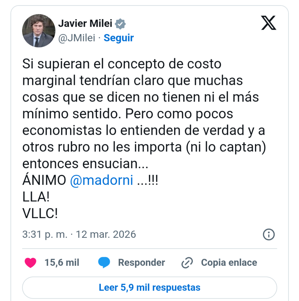 Milei, que tampoco es de cuidar las formas, se metió en la discusión utilizando una estrategia que hasta ahora parecía resultar efectiva. De tal manera que para defender a Adorni de las críticas de que la esposa viajó «con la nuestra», salió a «explicar» que no había un gasto adicional. «Si supieran el concepto de costo marginal tendrían claro que muchas cosas que se dicen no tienen ni el más mínimo sentido. Pero como pocos economistas lo entienden de verdad y a otros rubros no les importa (ni lo captan) entonces ensucian…», escribió.