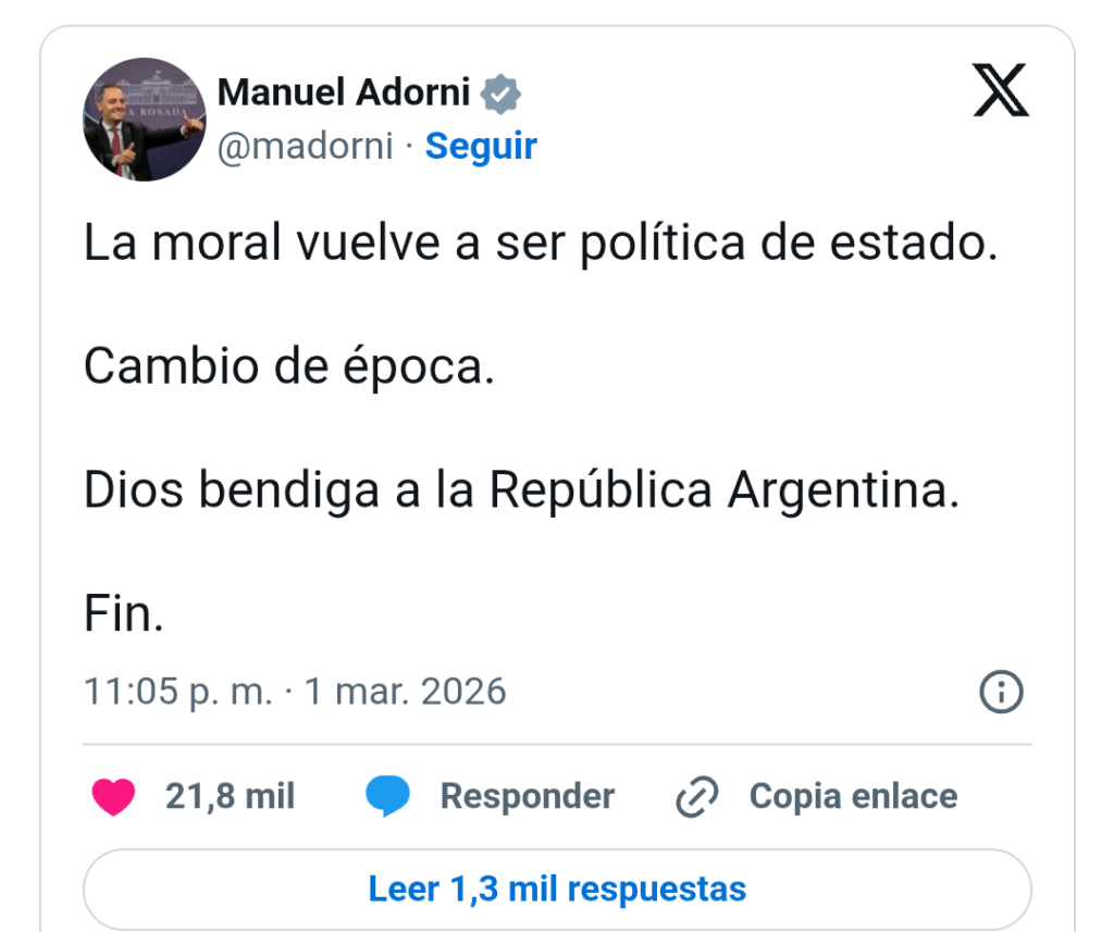 Hace exactamente dos domingos, cuando Milei habló ante el Congreso de la Nación para la apertura de sesiones ordinarias de este año, fue uno de los que más promocionó el lema con que imaginaban coronar un año benévolo luego de que la perinola de las elecciones de medio término –con la ayuda de Donald Trump y una oposición adormecida– cayó en «toma todo». «La moral vuelve a ser política de Estado. Cambio de época. Dios bendiga a la República Argentina.» tuiteó Adorni ese primero de marzo.