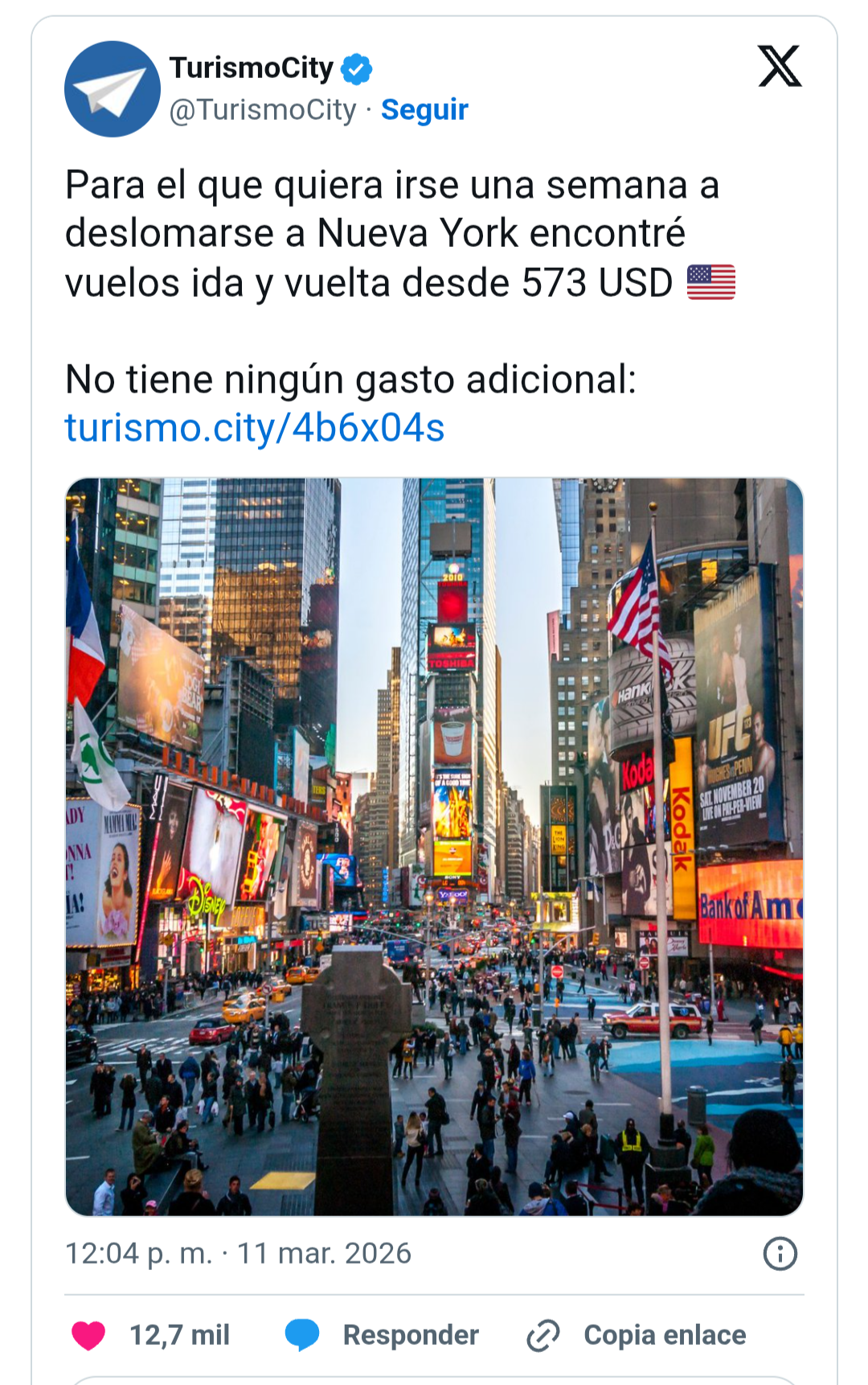 Hubo una agencia de turismo que captó al vuelo que con un poco de ingenio iban a saltar al estrellato. Y así lanzó una promo: «Para el que quiera irse una semana a deslomarse a Nueva York encontré vuelos ida y vuelta desde 573 USD».