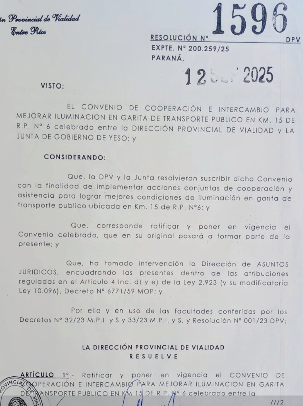 EL CONVENIO DE COOPERACIÓN E INTERCAMBIO PARA MEJORAR ILUMINACION EN GARITA DE TRANSPORTE PUBLICO EN KM. 15 DE R.P. N° 6 celebrado entre la DIRECCIÓN PROVINCIAL DE VIALIDAD Y LA JUNTA DE GOBIERNO DE YESO.