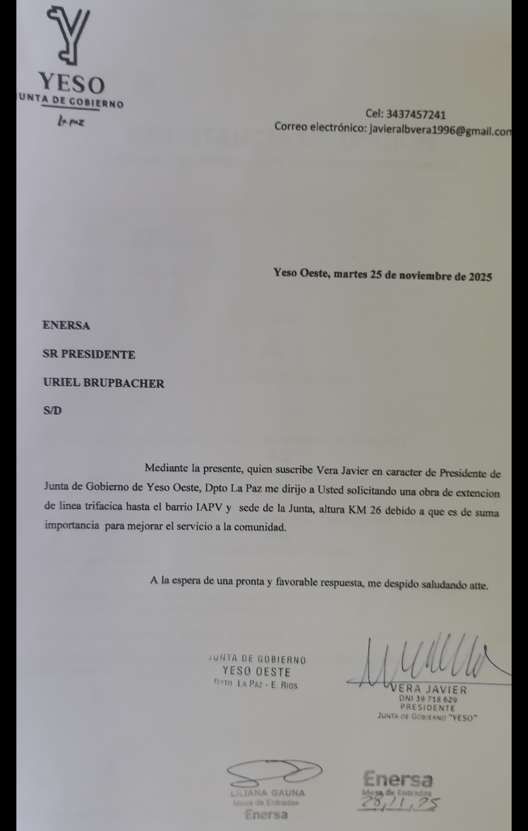 En los últimos días, el presidente de la Junta de Gobierno del distrito Yeso Oeste en el Departamento La Paz, Javier Vera, concretó gestiones a través del gobierno provincial. En principio se solicitó la implementación de programas de fortalecimiento en materia de salud mental. En otro momento y a través de Enersa, se avanzó en la posibilidad de mejorar luminarias para el barrio del IAPV y una bajada de línea trifásica que cubra al.nenos dos manzanas en el sector de la Junta.
